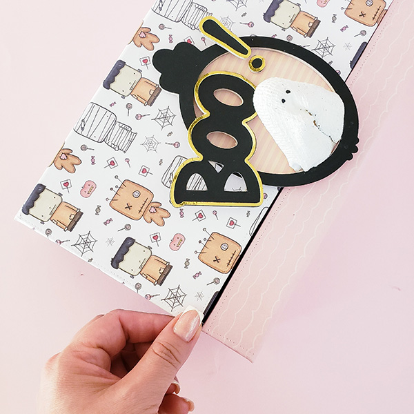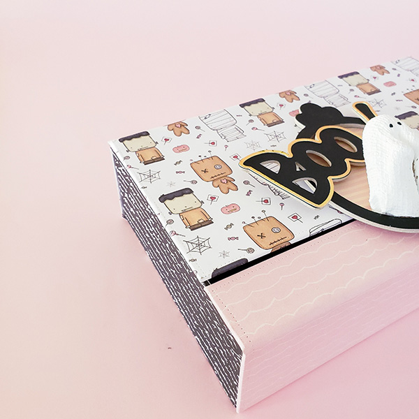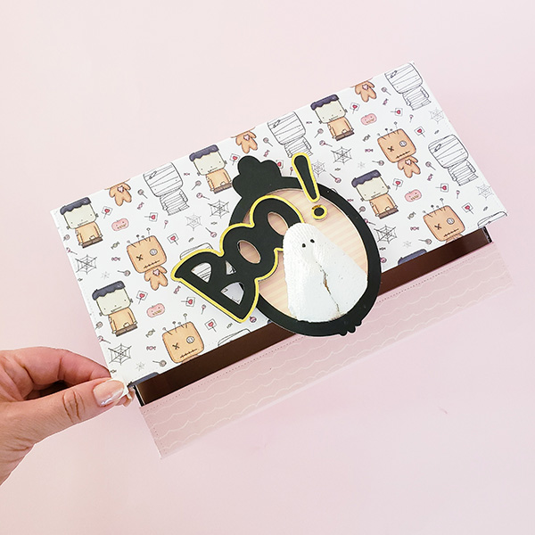 El proyecto que realizaremos , es un proyecto de cartonaje y formas donde crearemos una caja rectangular que lleva una aplicación en la portada de terror, un mini álbum con forma por dentro que te llenará de mucha creatividad para este halloween.